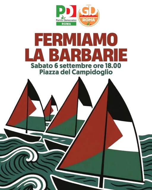Sabato 6 settembre alle 18,00 saremo in Piazza del Campidoglio, insieme a sindacati, associazioni e altri partiti politici per portare la nostra vicinanza all’iniziativa della Global Sumud Flotilla, partita per consegnare aiuti di prima necessità a Gaza, riaprire i corridoi umanitari e rompere l’assedio che tiene sotto embargo e in isolamento la popolazione palestinese.